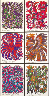 動(dòng)物系列繪畫,從扎實(shí)而靈動(dòng)的速寫與設(shè)計(jì)稿直至近似完美的正式作品,都蘊(yùn)含了畫家捕捉物象的執(zhí)著與機(jī)敏,提煉造型的睿智與不懈,有了心血與摯愛的投入,那成竹在胸別具一格的小貓小狗小豬小鵝小猴也就躍然紙上呼之欲出了。在長(zhǎng)方形的深色卡紙上,那銀色勾勒的活靈活現(xiàn)的百魚圖,讓我們沉醉于湛藍(lán)的海洋世界;在四方形的白色鏡框中,那七彩斑斕的百雞圖,讓我們迷戀于鄉(xiāng)間的濃郁風(fēng)情;還有鞠躬盡瘁一生奉獻(xiàn)膂力雄強(qiáng)的牛群系列,馳騁千里挾帶雄風(fēng)英姿勃勃的駿馬圖騰……