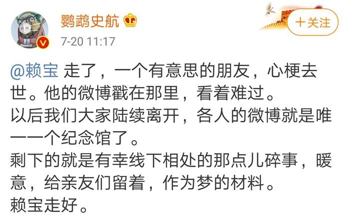 “以后我們大家陸續(xù)離開(kāi),各人的微博就是唯一一個(gè)紀(jì)念館了。剩下的就是有幸線下相處的那點(diǎn)兒碎事,暖意,給親友們留著,作為夢(mèng)的材料。賴寶走好。”史航寫(xiě)道。?