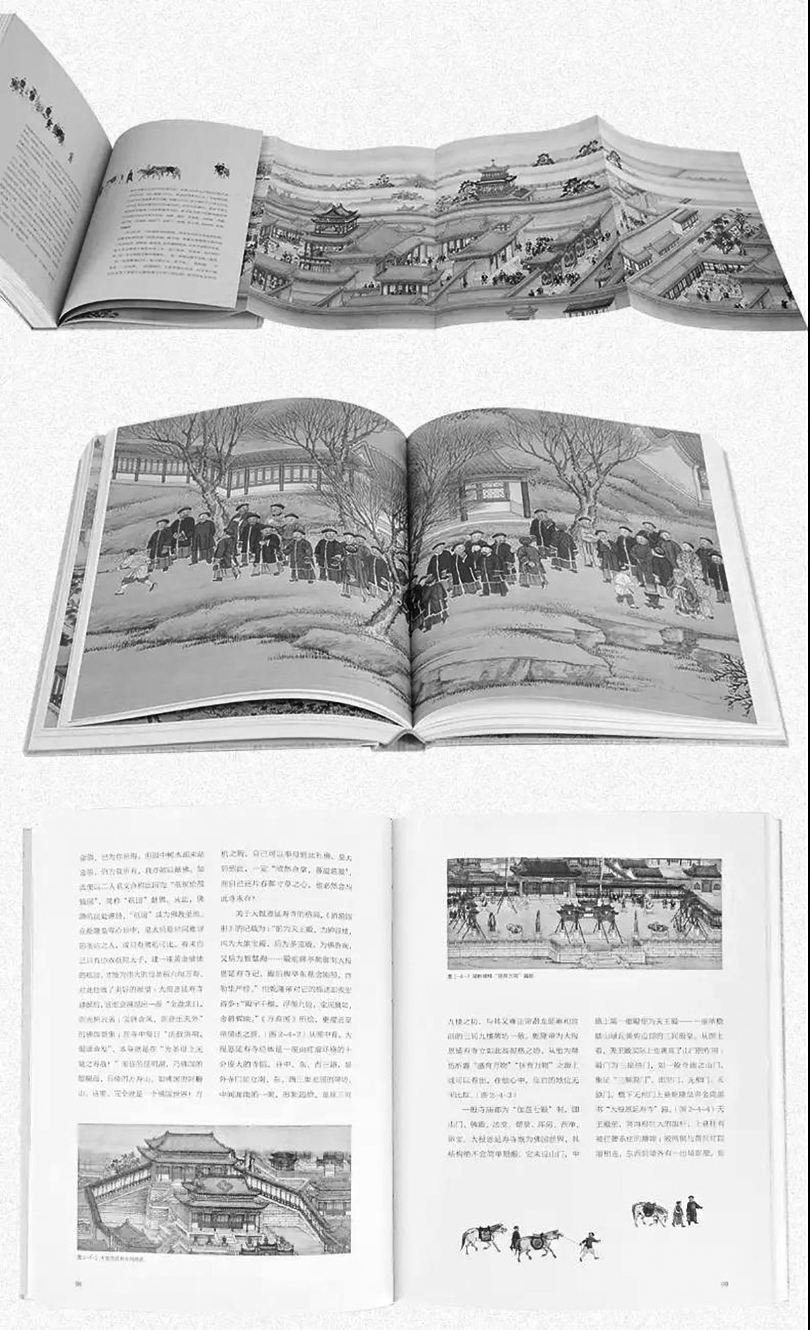 “左圖右史”的表述方式,其優(yōu)勢在于讀者一邊“索象于圖”,一邊“索理于書”,使“象”“理”緊密結(jié)合,實(shí)現(xiàn)以圖證史、以圖補(bǔ)史與圖文互證,具有“人亦易為學(xué),學(xué)亦易為功”的功效?!妒耸兰o(jì)京華盛景圖》一書,以精心繪制、精準(zhǔn)選擇、精美印制的“象”,和旁征博引、嚴(yán)謹(jǐn)考訂、精辟闡釋的“理”,步步交融互證。由于有圖,彌補(bǔ)了“僅以文字傳之而不能曲達(dá)其委折纖悉之致”的缺陷;由于有文,使讀者“見其形”且“聞其聲”,“見其人”且“聞其語”,實(shí)現(xiàn)了“兩美合并,二妙兼全”的融合。
