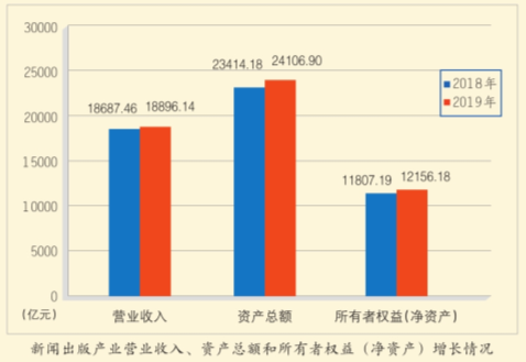 國(guó)家新聞出版署日前發(fā)布《2019年新聞出版產(chǎn)業(yè)分析報(bào)告》《2019年全國(guó)新聞出版業(yè)基本情況》。數(shù)據(jù)顯示,2019年,新聞出版產(chǎn)業(yè)規(guī)模繼續(xù)增長(zhǎng)。全國(guó)出版、印刷和發(fā)行服務(wù)實(shí)現(xiàn)營(yíng)業(yè)收入18896.1億元,較2018年增長(zhǎng)1.1%;擁有資產(chǎn)總額24106.9億元,增長(zhǎng)3.0%;所有者權(quán)益(凈資產(chǎn))12156.2億元,增長(zhǎng)3.0%。