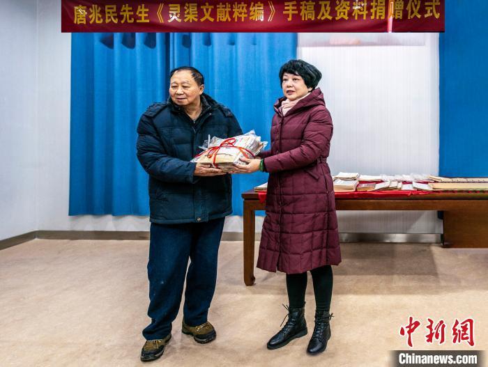 “卅載青燈知苦樂(lè),一篇黃卷薈磯珠。”捐贈(zèng)現(xiàn)場(chǎng),唐兆民兒子唐丁寧回憶其父親用四十年時(shí)間艱辛編撰《靈渠文獻(xiàn)粹編》出版后的感慨原話(huà)。