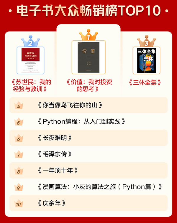 通過電子書暢銷榜TOP10和有聲暢銷榜TOP10可以看出,很多人愈發(fā)關(guān)注投資和管理等方面的內(nèi)容,也愈發(fā)注重個(gè)人學(xué)習(xí)?!秲r(jià)值:我對(duì)投資的思考》《蘇世民:我的經(jīng)驗(yàn)與教訓(xùn)》 分別位居電子書暢銷榜第一名和第二名?!吨袊?jīng)濟(jì)2020》《原則》進(jìn)入有聲暢銷榜前十。此外,學(xué)習(xí)類圖書《Python編程:從入門到實(shí)踐》《漫畫算法:小灰的算法之旅(Python篇)》也上榜電子書暢銷榜前十。