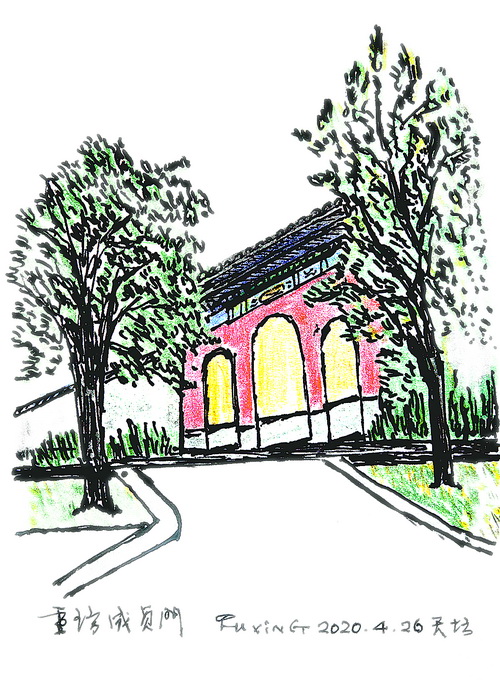 書已寫罷,小寒節(jié)氣過后,我又多次去天壇,不為寫作,只是習(xí)慣,仿佛腳步慣性,去天壇轉(zhuǎn)轉(zhuǎn),就會感覺充實(shí)一些。2020年1月20日正值大寒節(jié)氣,那天下午,我從圜丘到成貞門西北側(cè),那里并排有兩把座椅,我坐在座椅上畫成貞門。春節(jié)將近,除了工人在懸掛紅燈籠、安裝慶祝春節(jié)的展牌,天壇里的游人并不多。我和很多游人一樣,不知道,或者說不敏感,一場疫情正如餓虎撲食那樣向我們迫近。