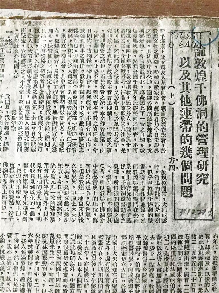 向達(dá)先生曾先后兩次考察敦煌,第一次是在1942年4月,中央研究院組織西北史地考察團(tuán),其中的歷史考古組由中央研究院歷史語言研究所、中央博物院與北京大學(xué)聯(lián)合組成,向達(dá)代表北大并擔(dān)任歷史考古組主任。在這次考察中,他在給友人、南京博物院院長曾昭燏的信件中講述了他第一次看到敦煌莫高窟時(shí)的激動(dòng)心情,同時(shí)對于莫高窟受到自然和人為的毀壞而感到痛心。他用三天的時(shí)間寫成了一萬多字、此后對敦煌學(xué)有重大影響的《論敦煌千佛洞的管理研究以及其他連帶的幾個(gè)問題》,署名“方回”寄給了傅斯年,后經(jīng)傅斯年推薦,在重慶的《大公報(bào)》連載發(fā)表,文中提出將千佛洞收歸國有,由學(xué)術(shù)機(jī)構(gòu)進(jìn)行管理,開展研究工作等建議。此文發(fā)表,一石激起千層浪,直接推動(dòng)國立敦煌藝術(shù)研究所于1944年成立。研究所成立后,常書鴻任所長。這也開啟了“敦煌學(xué)”長流不息的淵源。樊錦詩后來也撰文稱:“他(向達(dá))文章中提出的關(guān)于保護(hù)和管理的具體建議,被后來成立的敦煌藝術(shù)研究所采納,成為敦煌石窟保護(hù)和管理的參照。向達(dá)提出的‘不可輕易剝離壁畫’的主張,也是敦煌研究院幾十年來在壁畫保護(hù)和管理中一直恪守的紀(jì)律和原則。”