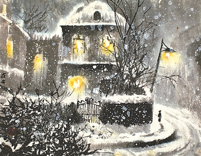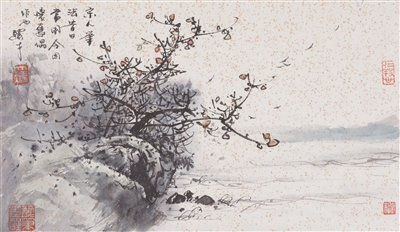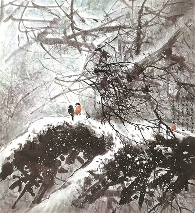 馮先生還和夫人在每年結(jié)婚紀(jì)念日時(shí)一起作畫(huà),“我們?nèi)ツ赀^(guò)了綠寶石婚,結(jié)婚55周年。每到結(jié)婚紀(jì)念日,都是我們倆人畫(huà)一幅,畫(huà)一對(duì)小鳥(niǎo)。早在六七十年代最艱苦的時(shí)候就開(kāi)始了,因?yàn)槲曳蛉艘彩钱?huà)畫(huà)的,我們那時(shí)一起畫(huà)了一對(duì)小鳥(niǎo)在風(fēng)雪里,那幅畫(huà)我現(xiàn)在還有。后來(lái)我們一直畫(huà)鳥(niǎo),風(fēng)景在不斷地變化,這和我們對(duì)生活的感受有很大的關(guān)系。”