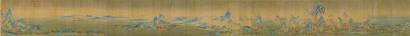 公元1100年19歲趙佶登基,年輕的宋徽宗開啟了屬于他的藝術(shù)新紀元。在徽宗傾力關(guān)心的翰林圖畫院中聚集了一大批優(yōu)秀的畫家,如李唐、朱銳、張擇端,其中李唐的《江山小景》,張擇端的《清明上河圖》都以手卷的形式描繪了從自然到都市的繁華,這樣的極致華麗是宋代院體山水畫卷的主旋律。最能體現(xiàn)華麗之美的山水卷莫過于出自當時還未入畫院,但已被徽宗視為“其性可教”并“親授其法”的18歲少年王希孟所繪的《千里江山圖》。此卷縱51.5厘米,橫1191.5厘米,可謂真正的長卷,所繪千山萬壑,峰巒起伏連綿,江河煙波浩渺壯麗,山林間有人物、飛泉、房舍、樓臺、林木、花竹、漁舟、游船,遠處島嶼相疊,汀渚綿延,水天相接,好一個理想中華麗光明的太平世界。山水是宇宙之大物,人在山林丘壑間游歷是見不到山水之全貌的。山水畫要將千里之景容納咫尺絹素,唯手卷的形制才得以在有限之內(nèi)展示無限的浩瀚。