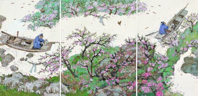 “芳草鮮美,落英繽紛。漁人甚異之,復前行,欲窮其林。”蔡皋輕聲道,“異”就是驚奇,正因有了好奇,才讓漁人鼓足勇氣,探尋奇境。“我傾注筆墨,來描繪漁人發(fā)現桃花源的整個過程。”