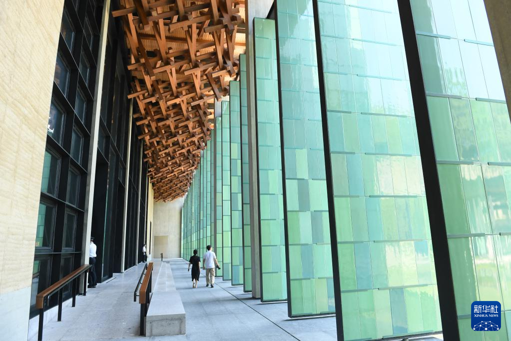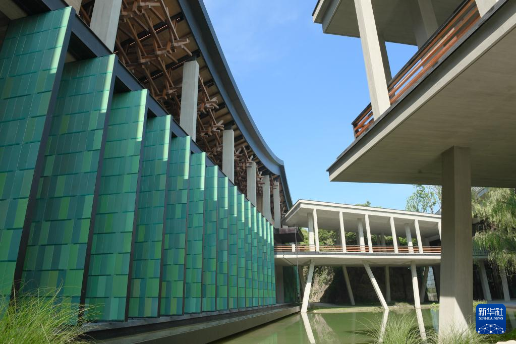 杭州國(guó)家版本館屋頂?shù)哪緲?gòu)和青瓷門扇相映成趣(7月23日攝)。