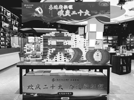 廣西新華書(shū)店集團(tuán)股份有限公司組織全區(qū)各連鎖門(mén)店先后開(kāi)展了“喜迎二十大 助力新發(fā)展”主題圖書(shū)展示展銷、“歡慶二十大 奮進(jìn)新征程”主題系列活動(dòng)。廣西新華書(shū)店集團(tuán)股份有限公司相關(guān)負(fù)責(zé)人介紹,全區(qū)門(mén)店近期開(kāi)展“歡慶二十大 奮進(jìn)新征程”主題門(mén)店美陳大賽,通過(guò)精選出111個(gè)全國(guó)近期出版的主題圖書(shū)品種進(jìn)行重點(diǎn)展示,配套主題海報(bào)、背景板,以各門(mén)店融合當(dāng)?shù)靥厣拇a堆造型進(jìn)行整體美陳,向廣大讀者推薦一批導(dǎo)向正確、質(zhì)量上乘的優(yōu)秀主題圖書(shū)。