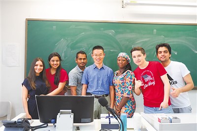 洪桐懷(左四)在北京語言大學(xué)的教室中和來華留學(xué)生合影。