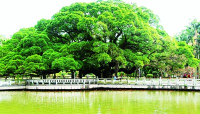 擁有古樹的城市就是擁有歷史的城市。福州古榕遍布,四季常青,是城市、市民生活與樹木的完美結(jié)合,是風(fēng)景的自然生長,是歷史根深葉茂地屹立。福州古榕以樹齡長、歷史久、數(shù)量眾而著稱。見證福州城市史的,當(dāng)首推鼓山國家森林公園、八一水庫旁,福州無人不知的已近千歲,被譽(yù)為福州榕樹王的古榕。相傳,這棵古榕是張伯玉所栽植的兩棵樹苖,光陰荏苒,同氣相求,如今兩棵榕樹相互糾結(jié)、勾連、纏繞、親密,已無分彼此。其冠幅達(dá)1300米,可容納千人在樹下談古論今,聊天遮陰。遠(yuǎn)望,似綠色陵巖;近看,知其為榕也,密密的枝葉把近午的陽光切割成碎花點,散落、閃亮在榕樹下的草坪和地衣上。初訪者或為訝異:偌大一棵古榕卻不見氣根,知榕者會告訴你,這是一株碩大、古老而不生氣根的細(xì)葉榕。因其冠幅日益長大,為了支撐沉重的樹冠、預(yù)防主干折損,便制作了若干石柱,砥柱其間。古榕下有湖塘,錦鯉游泳,不時生出紅色漣漪。旁有一碑,上刻:榕蔭照水波心漾,觀魚猶勝花間行。