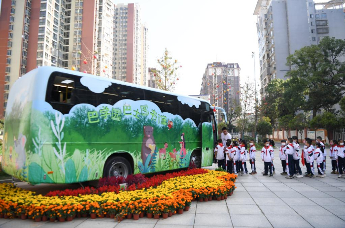 11月10日,長沙市青園友誼小學(xué)的學(xué)生排隊(duì)進(jìn)入巴士圖書館。