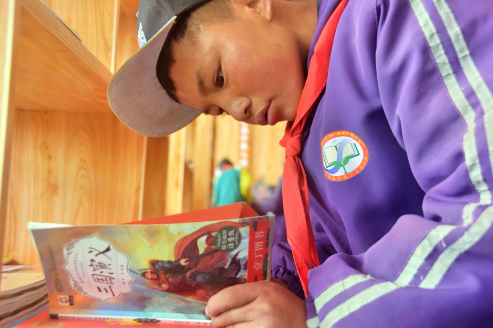 格桑加措的英語(yǔ)老師潘紅培將圖書(shū)整理分類,她來(lái)自河南,已在申亞鄉(xiāng)小學(xué)支教兩年多。她說(shuō):“書(shū)籍是給孩子們最好的禮物,使孩子們的心靈受到滋潤(rùn)、生活更加美好。有時(shí)候,他們吃飯時(shí)也要帶上書(shū)。”