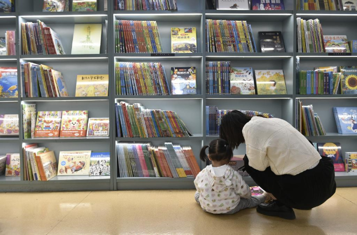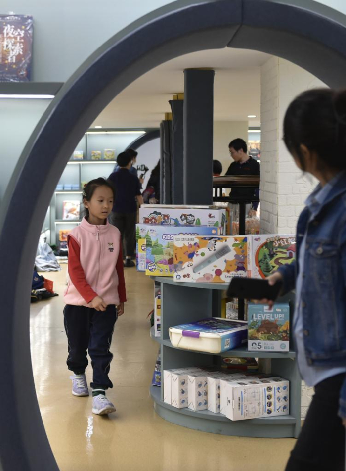 10月18日,家長帶著小朋友在鄭州市緯五路第一小學校園閱讀中心內(nèi)閱讀。