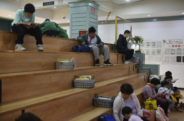 10月18日,小學生在鄭州市緯五路第一小學校園閱讀中心內(nèi)寫作業(yè)。