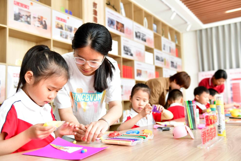 5月23日,在日照市東港區(qū)城市書房石臼所館,志愿者在教孩子制作黏土畫。