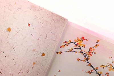 低首聞香,竹葉紙、桂花紙、蠟梅紙散發(fā)著獨(dú)有清香,在花葉紙上還能夠觸摸到真實的植物肌理;荸薺紙、無患子紙等果實紙上融入了肉眼可見的顆顆果粒;蜀葵紙、黃山欒紙、柿子紙等植物染色紙色彩繽紛,浸染著植物的天然原色;水印紙薄如蟬翼,透光可見植物圖案……摩挲間,24種花草紙有著獨(dú)屬于不同時節(jié)的味道,自然之美,蘊(yùn)蓄其中。