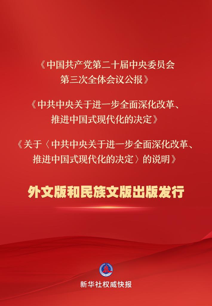 《中國共產(chǎn)黨第二十屆中央委員會第三次全體會議公報》《中共中央關于進一步全面深化改革、推進中國式現(xiàn)代化的決定》《關于<中共中央關于進一步全面深化改革、推進中國式現(xiàn)代化的決定>的說明》的英文、法文、西班牙文、日文、俄文、德文、阿拉伯文、葡萄牙文、越南文、老撾文等10種外文版已由中央編譯出版社、外文出版社出版,面向國內(nèi)外公開發(fā)行。