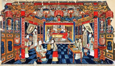 整幅年畫為我們呈現(xiàn)了一個處處燈光相映、人人語笑喧闐的祥和景象。畫中人物采用中國繪畫技法,線描敷色均呈現(xiàn)平面化特征,而居室空間則采用在清代稱為“線法畫”的技法,借鑒西方焦點透視法,使畫面產(chǎn)生立體感,將觀者的目光緩緩引入熱鬧溫馨的場景之中。