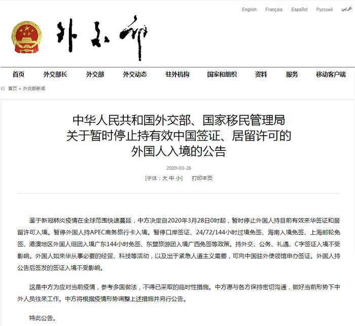 3月26日,中華人民共和國(guó)外交部、國(guó)家移民管理局發(fā)布《關(guān)于暫時(shí)停止持有效中國(guó)簽證、居留許可的外國(guó)人入境的公告》(以下簡(jiǎn)稱《公告》),決定28日起,暫時(shí)停止外國(guó)人持目前有效來華簽證和居留許可入境。