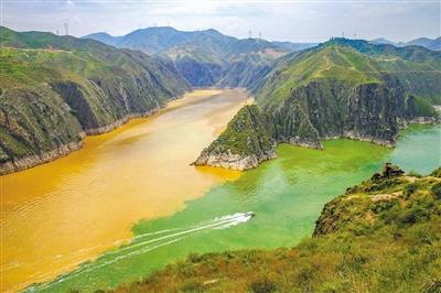 在永靖縣的劉家峽大壩前,綠色的黃河與黃色的洮河呈“Y”字形在龍匯山下交匯,在兩條河流的交匯處,也是一清一濁,互不交融,也形成了一條“涇渭分明”的水中分界線。一黃一綠兩條河流交匯以后河水也并沒(méi)有融合為一,而是繼續(xù)保持黃綠兩色前行,直到流入一公里多外的劉家峽大壩。