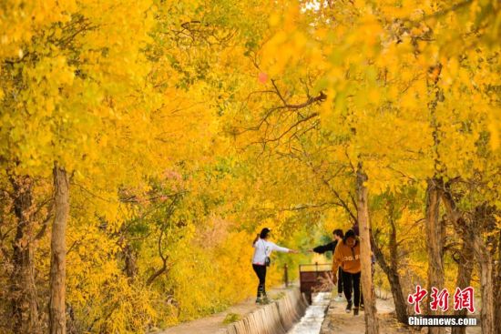 圖為胡楊秋色吸引不少游客和敦煌市民前來賞秋。 王斌銀 攝