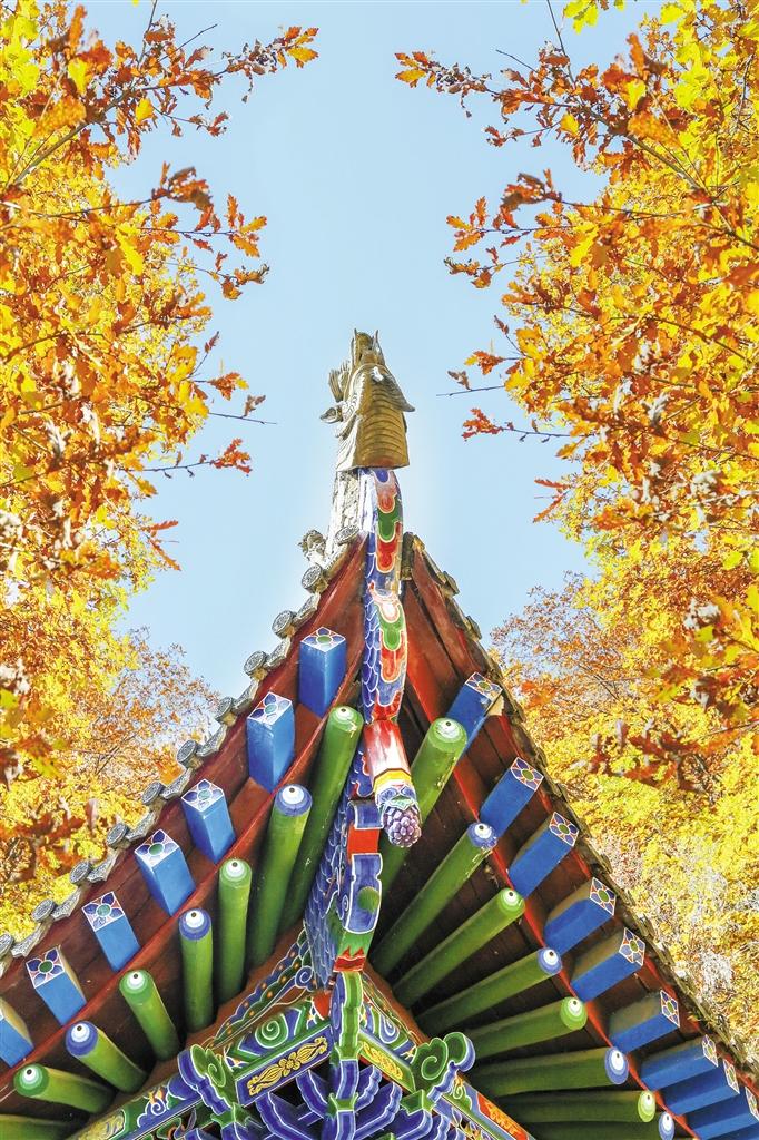 在秋天,興隆山不只有紅葉,與青岡樹相伴的還有山楊落葉松和樺樹,它們的枝頭像棲滿了黃蝶。一片片野山楊,在初陽的照耀下,純粹的本色的黃,如波浪流動,漫過一道道山脊,充盈一處處山彎。一片片白樺林,也是那么衷情,帶些褐色的黃在蒼翠的松柏云杉間,同掩映在峰巒間寺院道觀的翹角飛檐色調完全一致,格外讓人留戀。