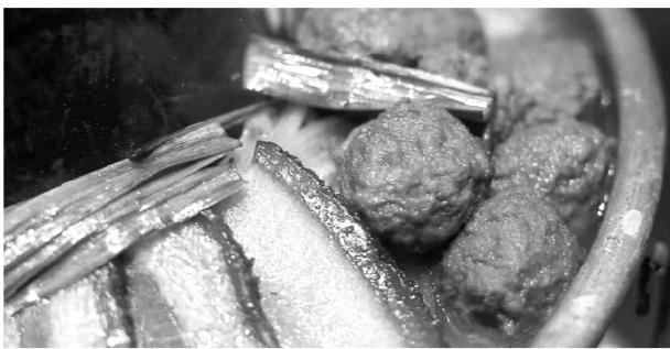 紅燒肉還有番外篇,一碗熬蘿卜燒肉讓此行臻于完美。熬,此處念平聲跟我們通常所說的煮菜有些類似,但不同的是,煮菜用清水,熬菜用肉湯。熬蘿卜會吸收湯的香味,變得軟糯爽口,這也就是熬菜的精妙之處。簡單地爆香蒜苗,加上幾片做好的紅燒肉,蓋在這蘿卜上,于是一碗高端大氣的菜品就出現(xiàn)了。