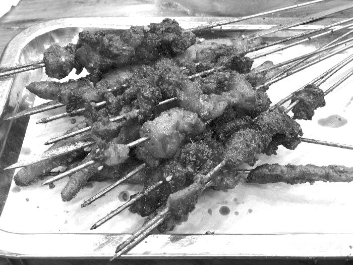 一般到下午四五點鐘就賣完了,把生意留給對面的烤肉??救鈱儆诟煽镜牧髋?,每一串都是三瘦一肥,很香。