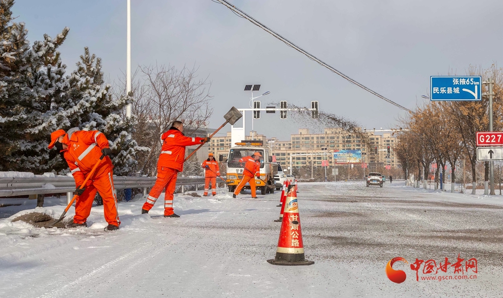12月12日,甘肅省張掖公路局職工在國道227線撒鋪防滑料。