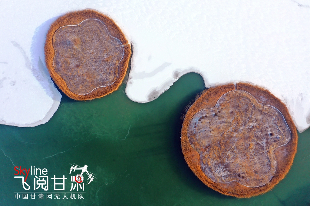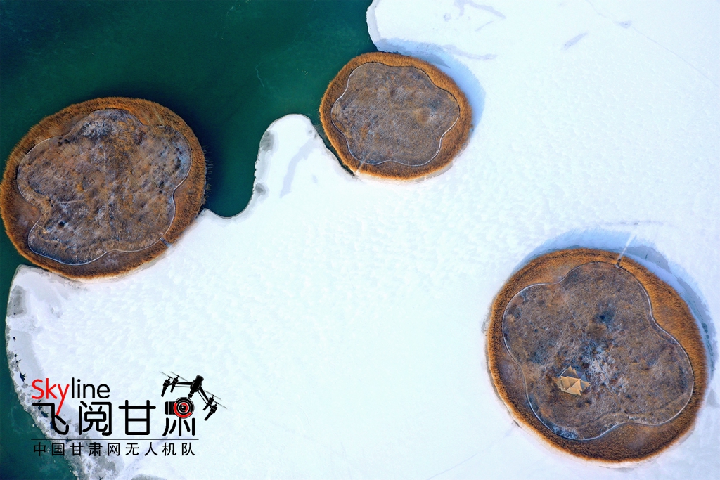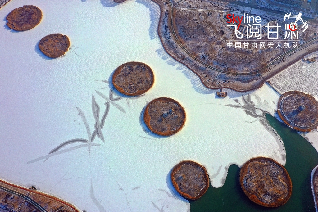 12月13日,甘肅省張掖潤泉湖公園在冰面白雪映襯下,美如畫卷,別有一番意境。