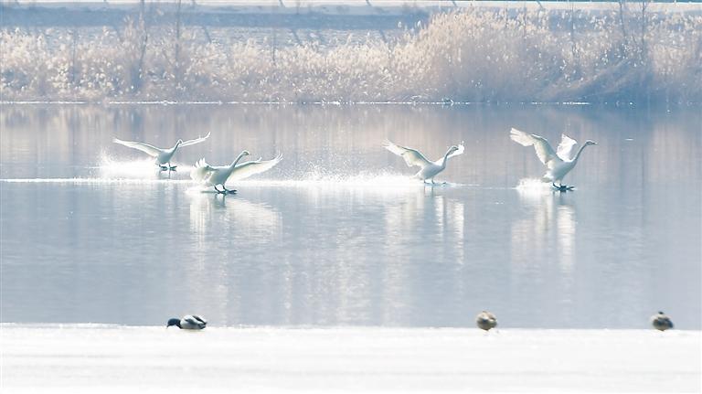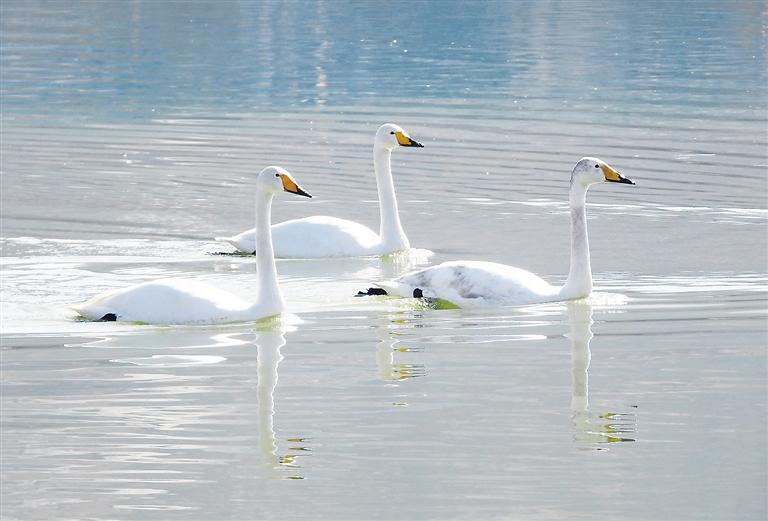近日,永靖縣鹽鍋峽鎮(zhèn)境內的黃河八盤峽水庫成為天鵝等候鳥越冬的樂園,它們在此棲息、覓食,成為冬日黃河里的一道靚麗風景。 本報記者 史有東 攝