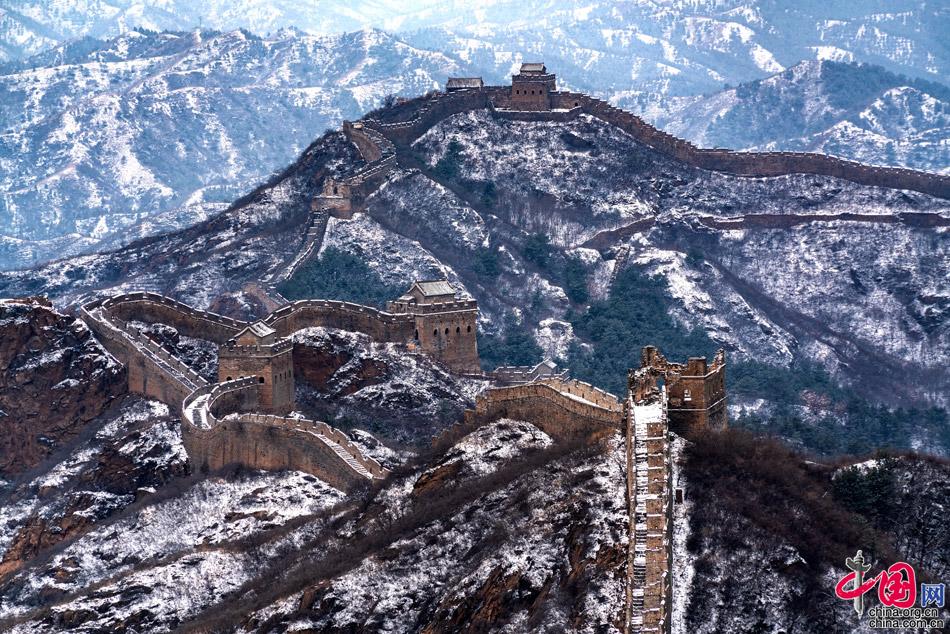 在春雪覆蓋下,山巒起伏,壯觀的長城在崇山峻嶺之巔如巨龍飛舞,一幅雪墨丹青,令人向往。