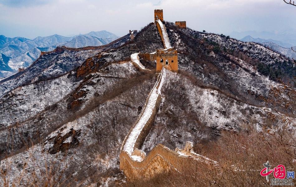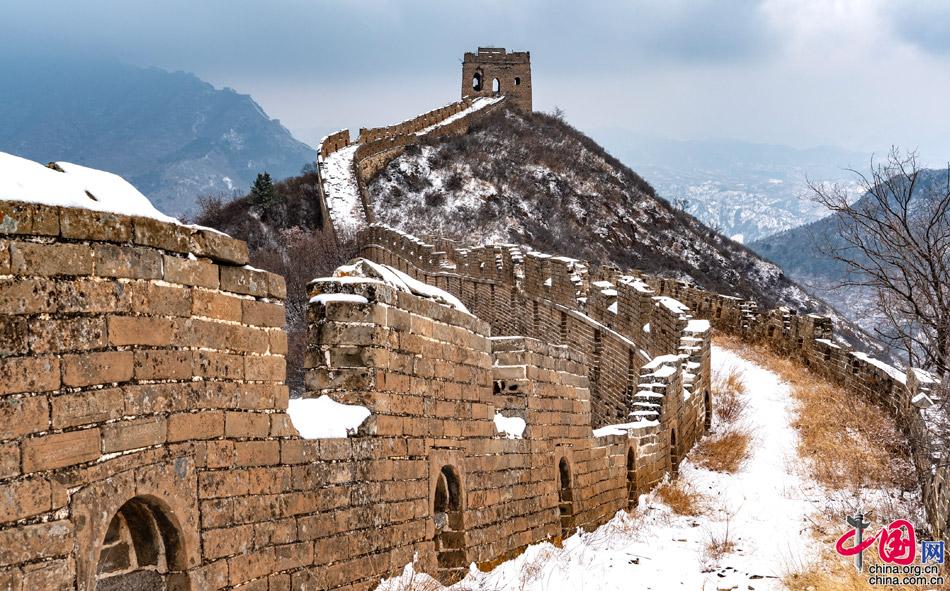 春雪飄灑,一朵朵相擁著落下,氣溫驟降,給人帶來一絲涼意。金山嶺海拔700米,長城依山憑險,起伏跌宕于山水之間,形勢極為雄奇。金山嶺長城是明代修筑的一段長城,西起歷史上著名的關(guān)口古北口,東至高聳入云的望京樓,全長10.5公里,沿線設(shè)有大小關(guān)隘5處,敵樓67座,烽燧2座,因其視野開闊,敵樓密集,景觀奇特,建筑藝術(shù)精美,軍事防御體系健全,保存完好而著稱于世。
