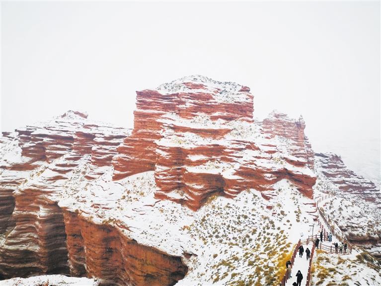 游客在景區(qū)觀景臺(tái)上伸手可觸摸到被白雪覆蓋的火紅色彩,峽谷內(nèi),山倚壁蜿蜒,峰隨地勢(shì)崢嶸,石林犬牙交錯(cuò),游客不時(shí)發(fā)出由衷的贊嘆,眼前的風(fēng)光如仙境一般。