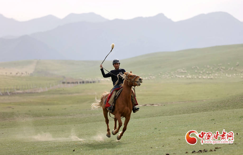 夏日,位于祁連山北麓的甘肅張掖山丹馬場綠草如茵,牧馬人揚鞭催馬,山丹馬場再現萬馬奔騰景象。