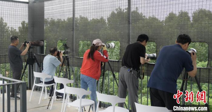 圖為鳥(niǎo)類(lèi)攝影愛(ài)好者在觀鳥(niǎo)平臺(tái)上進(jìn)行拍攝?!∩G锶A 攝