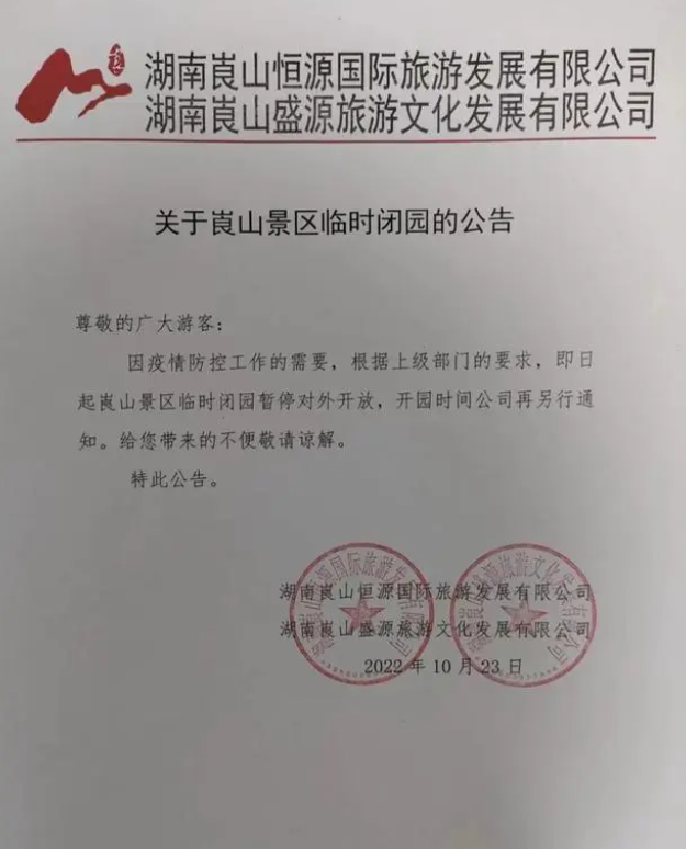 10月25日電 10月24日,崀山旅游區(qū)發(fā)布《關(guān)于崀山景區(qū)臨時閉園的公告》稱,因疫情防控工作的需要,根據(jù)上級部門的要求,10月24日起崀山景區(qū)臨時閉園,暫停對外開放,開園時間將另行通知。
