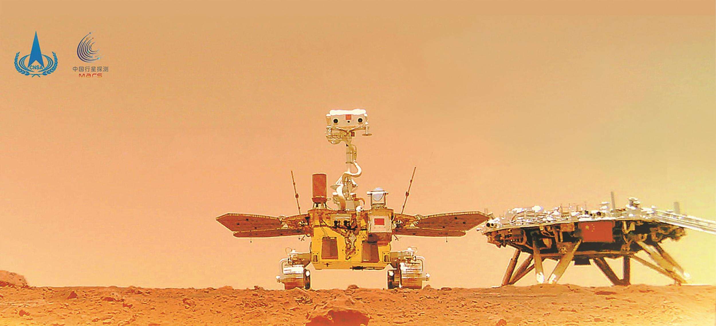 中國首次火星探測天問一號(hào)任務(wù)“祝融號(hào)”火星車與著陸器合影。國家航天局供圖