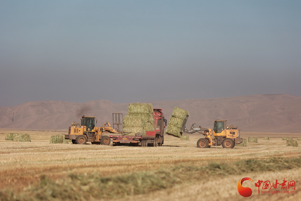 11月9日,甘肅山丹馬場(chǎng)正在對(duì)此前收割晾曬的21萬(wàn)畝燕麥草打包運(yùn)輸,一輛輛大型農(nóng)用機(jī)械穿梭田間忙碌作業(yè)。