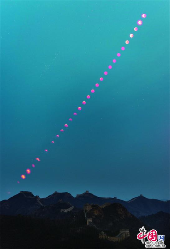 11月8日,月全食(紅月亮)天象驚艷亮相金山嶺長城。(紀(jì)正權(quán) 張愛東