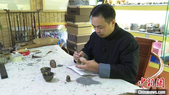 蔣繼濤正在雕刻陶藝品。巨野縣委宣傳部供圖
