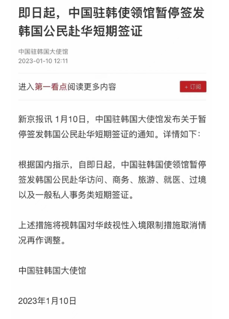 今天,中國駐韓國大使館發(fā)布《關于暫停簽發(fā)韓國公民赴華短期簽證的通知》(以下簡稱《通知》)。通知稱,根據(jù)國內(nèi)指示,自即日起,中國駐韓國使領館暫停簽發(fā)韓國公民赴華訪問、商務、旅游、就醫(yī)、過境以及一般私人事務類短期簽證。
