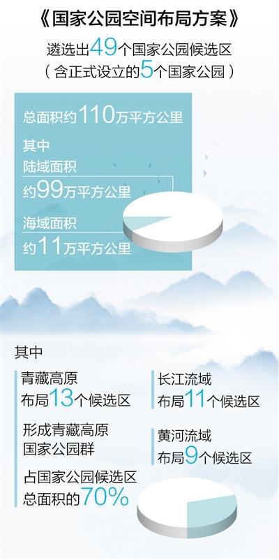 在空間布局上,遴選出49個國家公園候選區(qū)(含正式設(shè)立的5個國家公園),總面積約110萬平方公里,其中陸域面積約99萬平方公里、海域面積約11萬平方公里,占陸域國土面積的10.3%。充分銜接國家重大戰(zhàn)略和重大生態(tài)工程,其中,青藏高原布局13個候選區(qū),形成青藏高原國家公園群,占國家公園候選區(qū)總面積的70%;長江流域布局11個候選區(qū),黃河流域布局9個候選區(qū)。全部建成后,中國國家公園保護(hù)面積的總規(guī)模將居世界第一。
