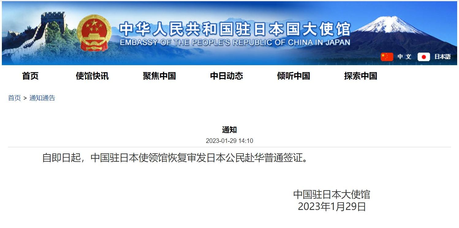 中國(guó)駐日本使領(lǐng)館1月29日宣布:自即日起,中國(guó)駐日本使領(lǐng)館恢復(fù)審發(fā)日本公民赴華普通簽證。
