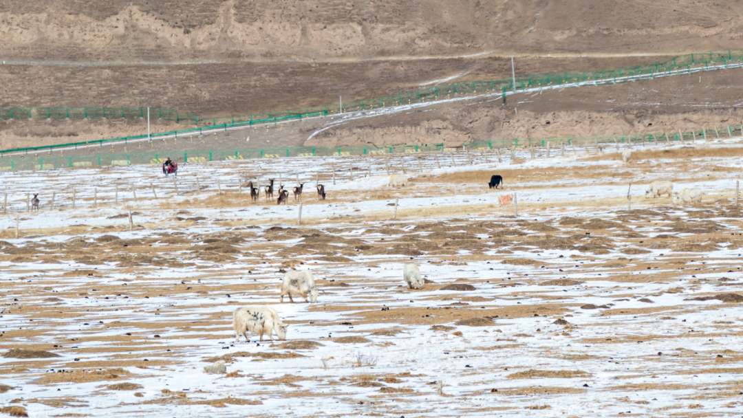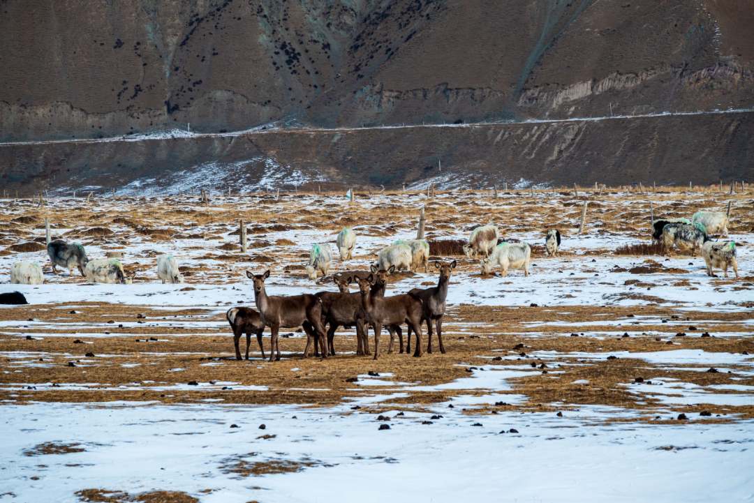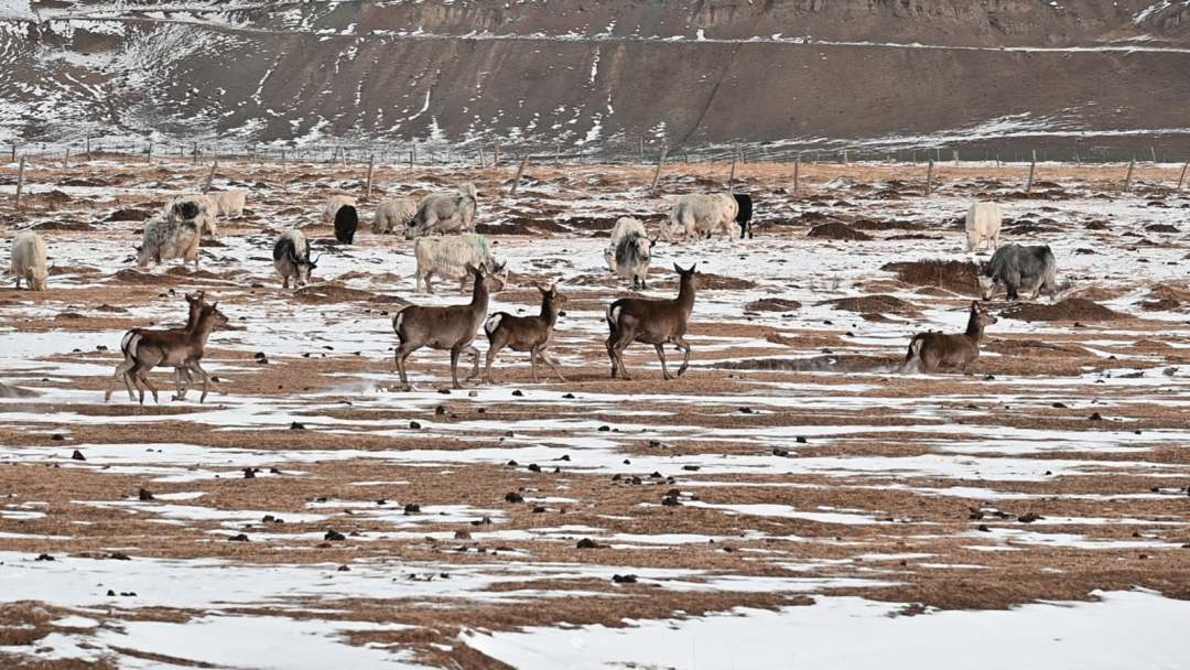 近日,在武威市天祝藏族自治縣抓喜秀龍草原上,野生的狍鹿和牧民家養(yǎng)的白牦牛同食牧草,構(gòu)成一幅和諧動(dòng)人的自然圖景。張廷愛(ài)攝。