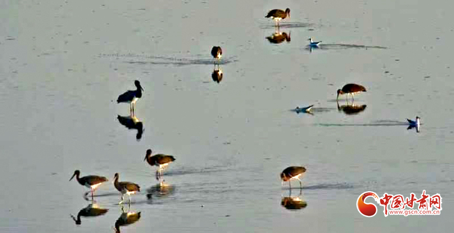 近日,山丹縣濕地保護(hù)站工作人員在開展候鳥監(jiān)測工作時(shí)發(fā)現(xiàn)14只被稱為“鳥中大熊貓”的黑鸛。