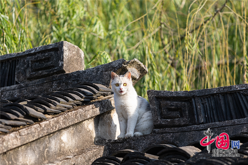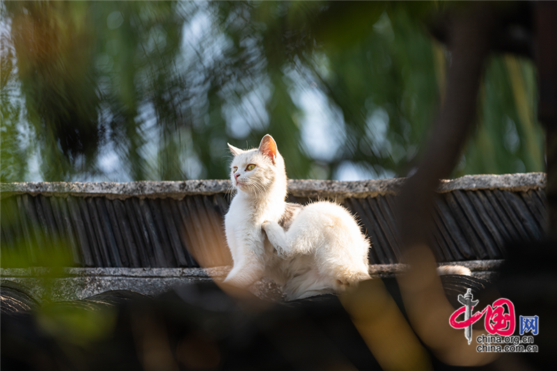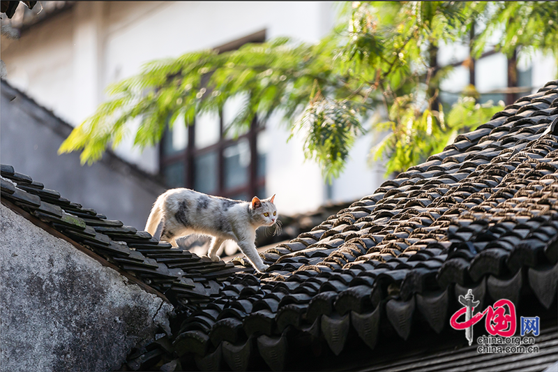 在毛孩子眼里,這就是包容一切活動的「游樂場」,片片青瓦上留下梅花印?;蛟S你也該往古鎮(zhèn)的屋頂上瞧,檐角翹伸、清風古韻,讓人心曠神迷。或同那只貓一樣攀上高處,推窗看那水那橋,那木門青瓦,就是江南水鄉(xiāng)的具象。