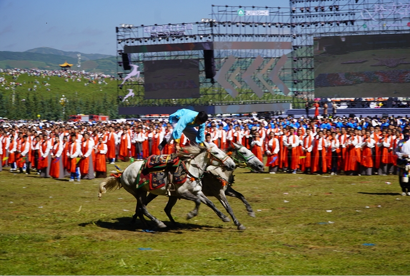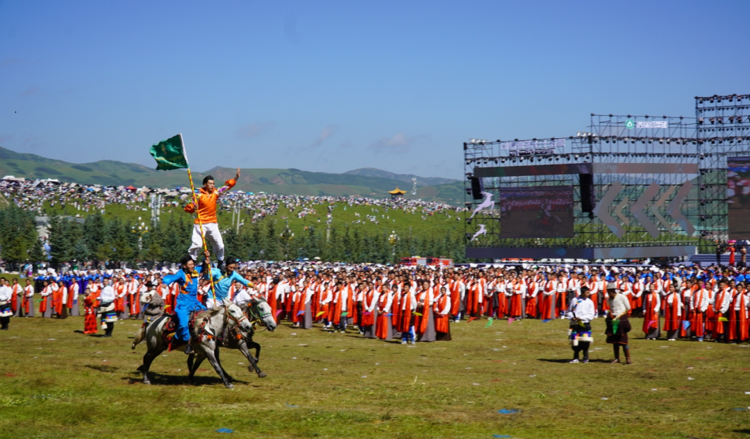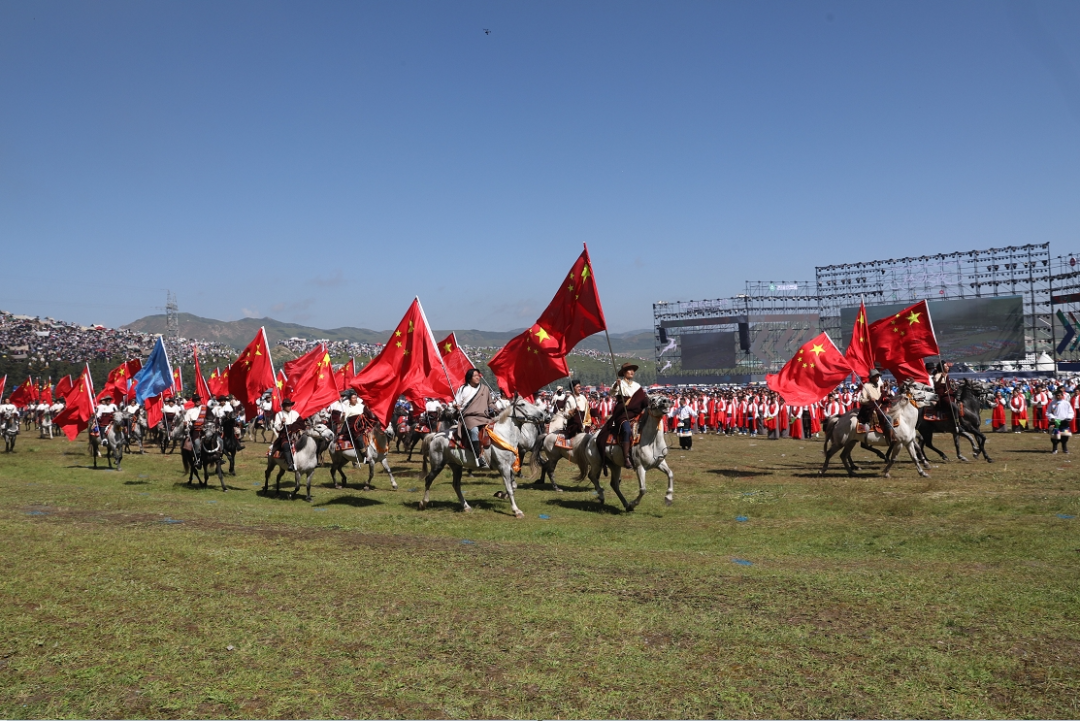 草原騎手乘著矯健的駿馬高舉著鮮艷的五星紅旗從主席臺(tái)前奔馳而過(guò),讓在場(chǎng)的數(shù)萬(wàn)觀眾贊嘆不已,呈現(xiàn)出一個(gè)絢麗多彩的甘南、和諧穩(wěn)定的甘南、朝氣蓬勃的甘南、包容開(kāi)放的甘南、團(tuán)結(jié)奮進(jìn)的甘南。