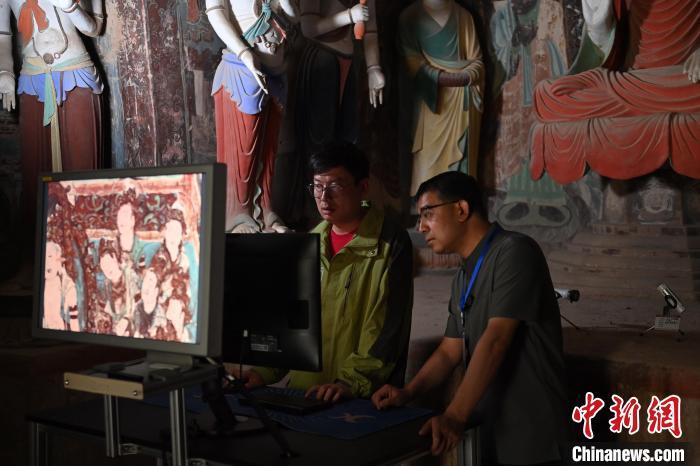 6月5日,敦煌莫高窟內(nèi),敦煌研究院文物數(shù)字化研究所工作人員進行敦煌壁畫數(shù)字化圖像現(xiàn)場檢查工作。中新社記者 李亞龍 攝